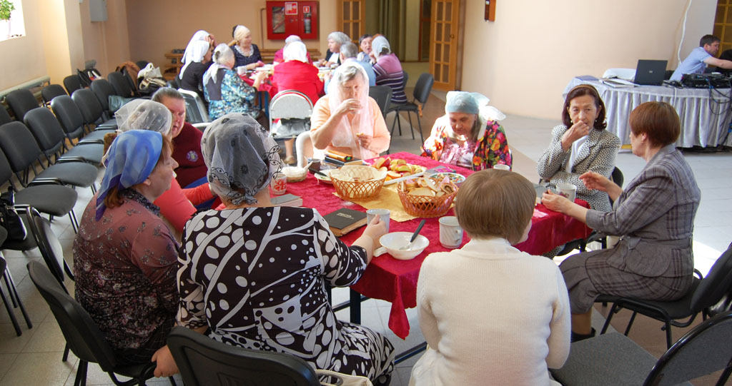 Наши старицы и старцы заняли почетные места за накрытыми столиками.