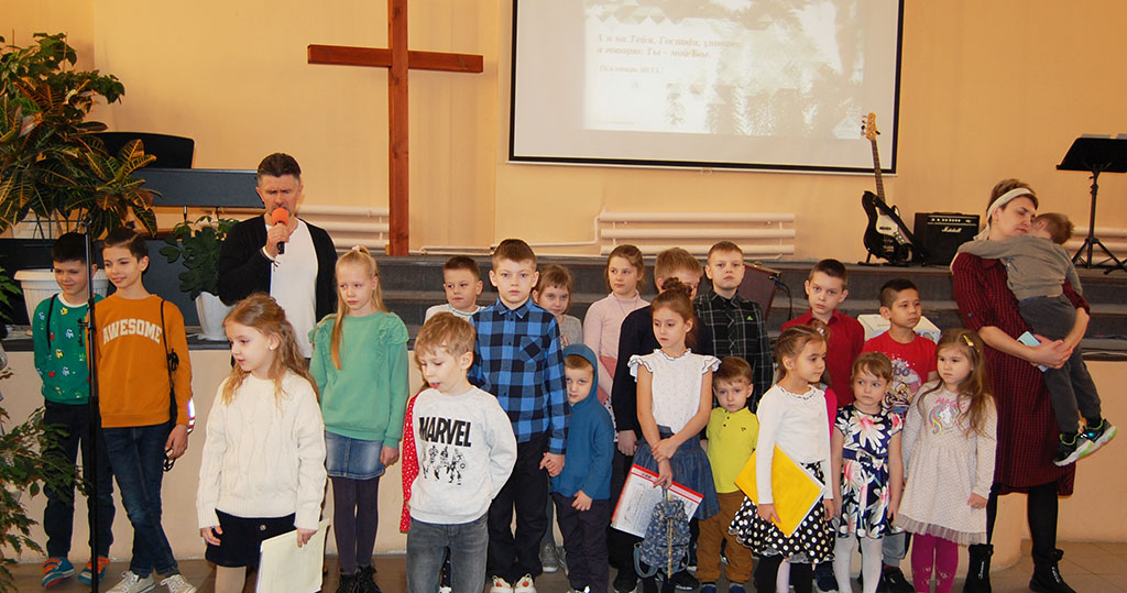 Воскресное богослужение начинается в 11.00. Дети присутствуют в первой части (около 30 минут) богослужебного собрания. Для них звучит библейская проповедь, после которой они проходят в классы занятий.