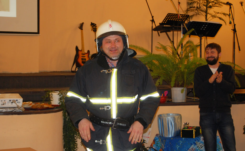 Чтобы потушить семейную ссору, мужья соревновались на время, кто вперед оденет снаряжение пожарного.